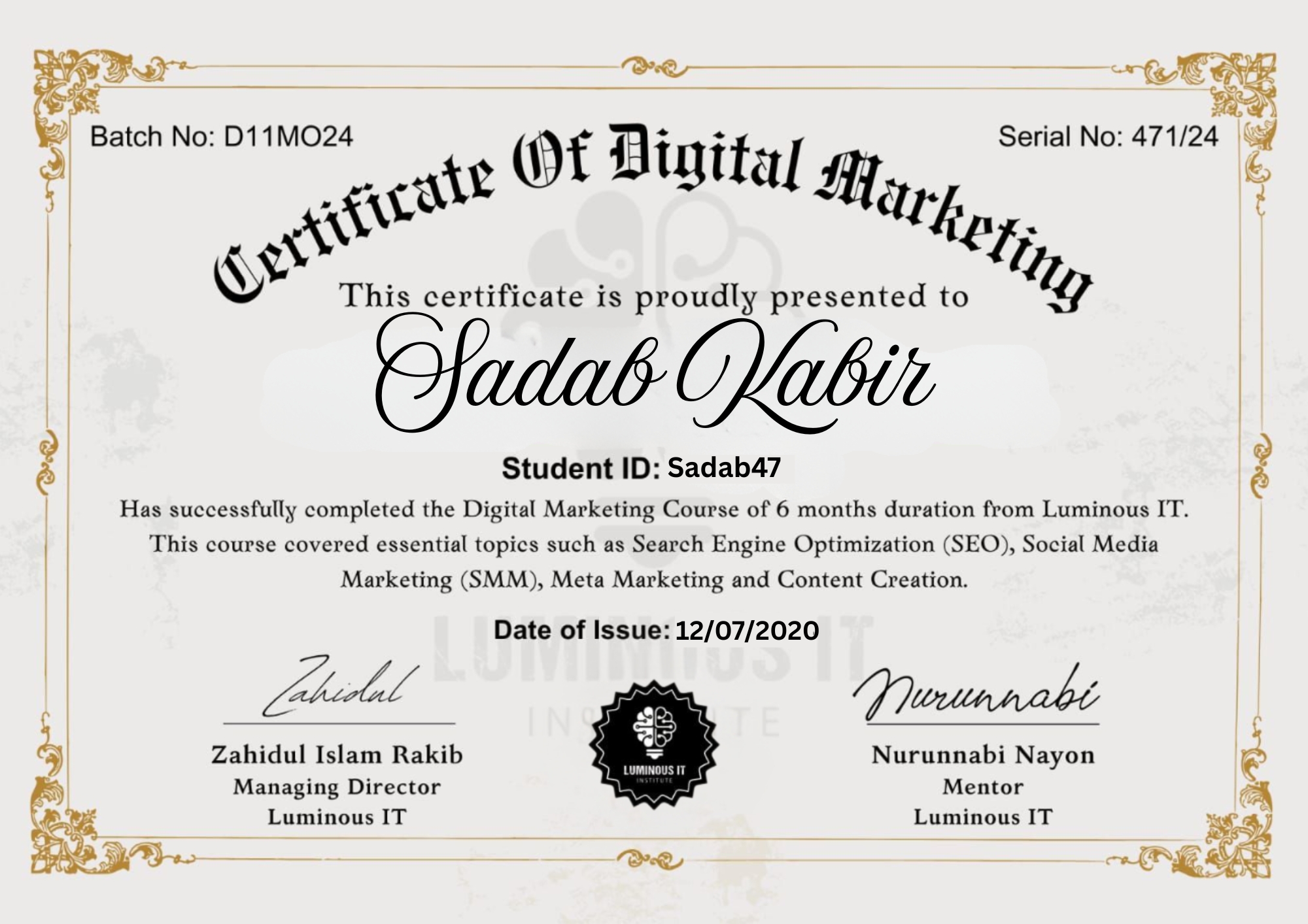 Certified in Digital Marketing by Luminous IT