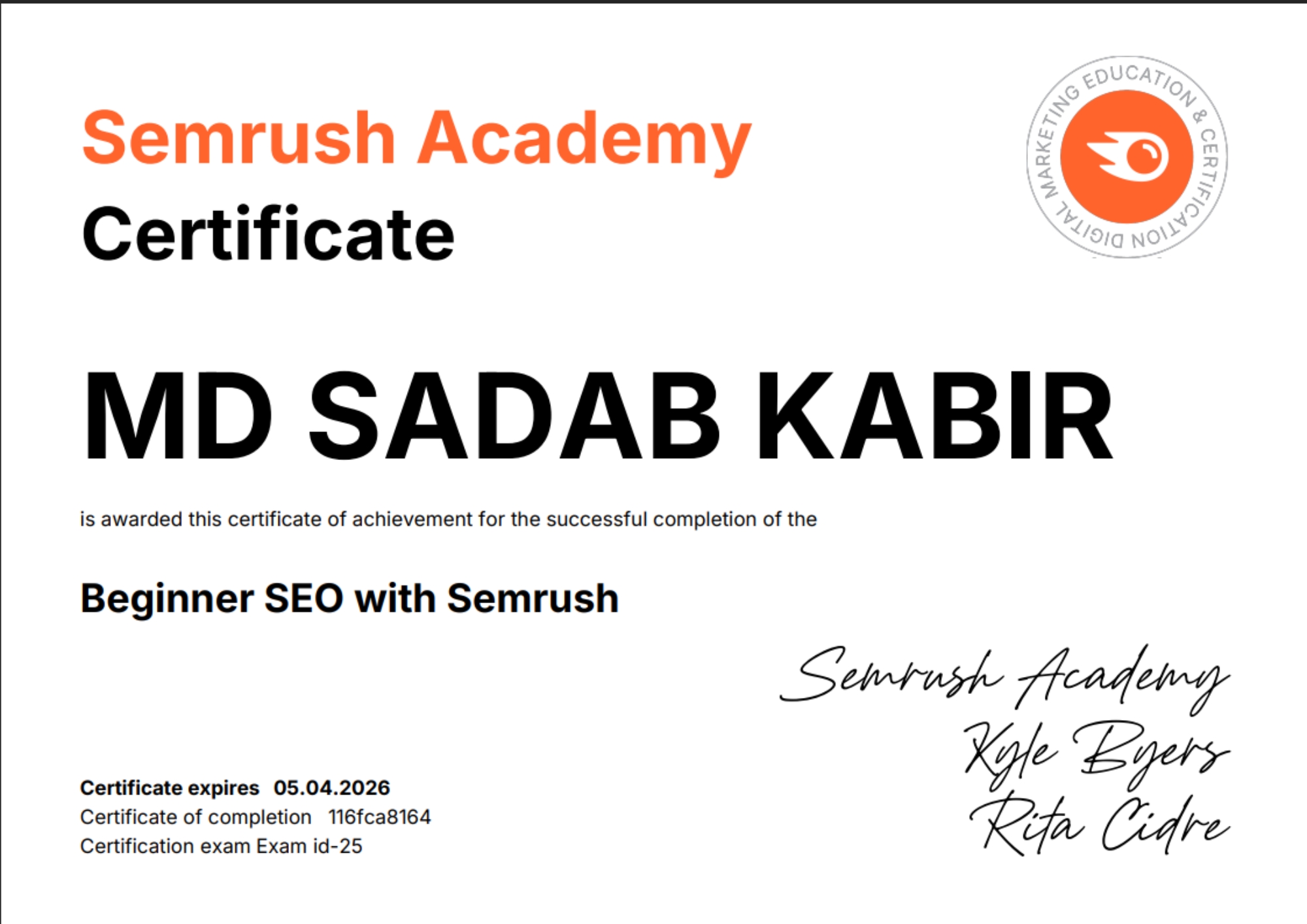 Certified in SEO by SEMrush